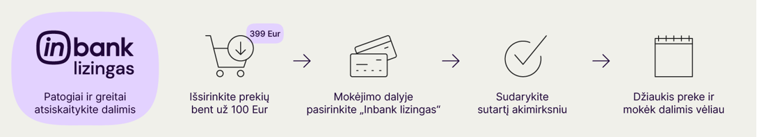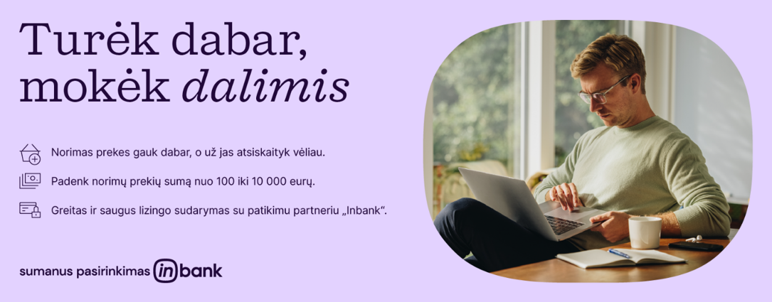 Neatidėliokite pirkimo, iš karto įsigykite prekes lizingu ir mokėkite dalimis vėliau! Bendradarbiaudami su „Inbank“ siūlome puikią galimybę dideles, vienkartines išlaidas paversti nedidelėmis mėnesinėmis išlaidomis.