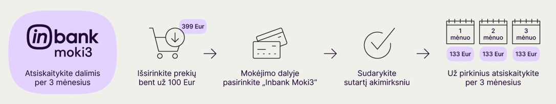 Inbank Moki3 – tai nuolaida, kai sudarius 24-72 mėn. prekių finansavimo sutartį prekėms ar paslaugoms, Jums suteikiama galimybė pasirinkti – atsiskaityti už savo pirkinius per 3 mėnesius lygiomis dalimis be pabrangimo arba mokėti pagal 24-72 mėn. grafiką mažesnėmis įmokomis su palūkanomis ir kitais mokesčiais.